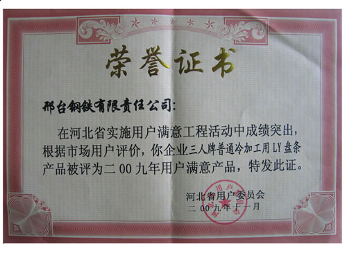 三人牌拉拔用中高碳鋼盤條被評(píng)為2009年河北省用戶滿意產(chǎn)品