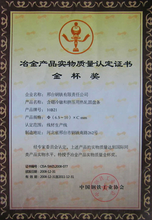 含硼冷鐓和冷擠壓用鋼盤條獲冶金產(chǎn)品實(shí)物質(zhì)量金杯獎(jiǎng)