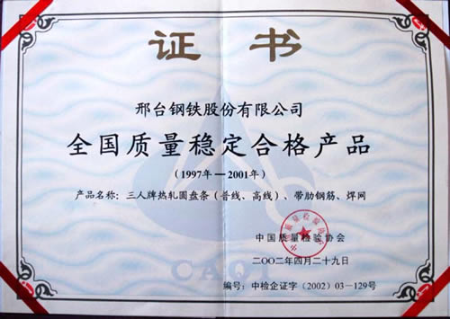 三人牌熱軋圓盤(pán)條、帶肋鋼筋、焊網(wǎng)獲全國(guó)質(zhì)量穩(wěn)定合格產(chǎn)品