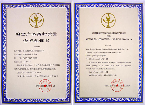 低碳鋼熱軋圓盤(pán)條Q195,Q215,Q235獲冶金產(chǎn)品實(shí)物質(zhì)量金杯獎(jiǎng)