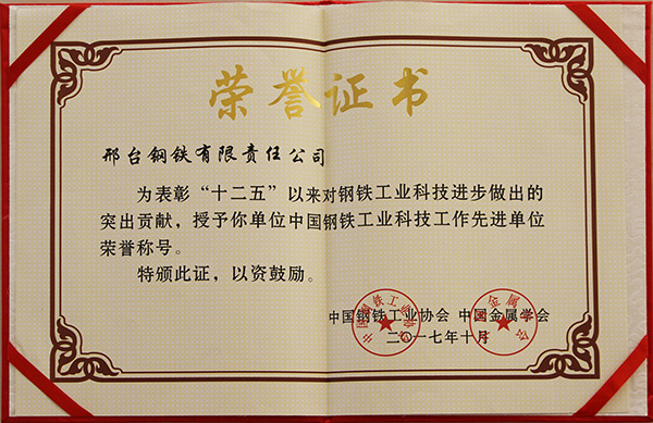 2017年10月,邢鋼被中國(guó)鋼鐵工業(yè)協(xié)會(huì)和中國(guó)金屬學(xué)會(huì)聯(lián)合授予“十二五”中國(guó)鋼鐵工業(yè)科技工作先進(jìn)單位榮譽(yù)稱號(hào)。