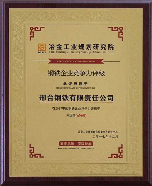 2017年12月,冶金工業(yè)規(guī)劃研究院競(jìng)爭(zhēng)力評(píng)級(jí)中心授予邢鋼“在2017中國(guó)鋼鐵企業(yè)競(jìng)爭(zhēng)力評(píng)級(jí)中評(píng)定為A特強(qiáng)”企業(yè)。