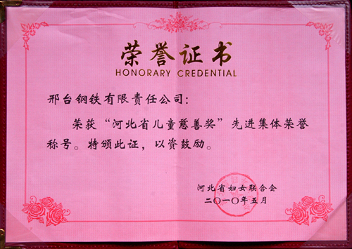 2010年5月,邢鋼榮獲“河北省兒童慈善獎”先進(jìn)集體榮譽稱號。