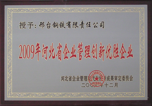 2009年12月,邢鋼榮獲“2009年河北省企業(yè)管理創(chuàng)新優(yōu)勝企業(yè)”榮譽稱號。