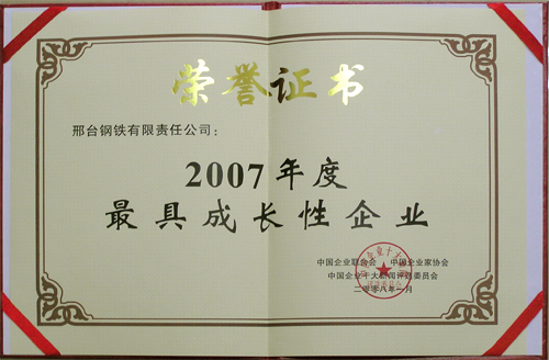 2008年1月,邢鋼榮獲由中國企業(yè)聯(lián)合會、中國企業(yè)家協(xié)會頒發(fā)的“2007年度最具成長性企業(yè)”榮譽(yù)稱號。