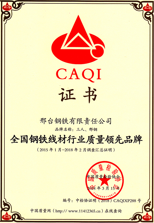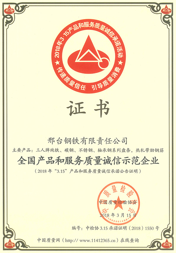 2018年3月15日,邢鋼(主要產(chǎn)品:三人牌純鐵、碳鋼、不銹鋼、軸承鋼系列盤條和熱軋帶肋鋼筋),被中國質(zhì)量檢驗(yàn)協(xié)會授予“全國產(chǎn)品和服務(wù)質(zhì)量誠信示范企業(yè)”稱號。