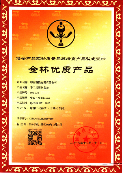 邢鋼手工具用鋼盤條50BV30榮獲“金杯優(yōu)質產(chǎn)品”稱號