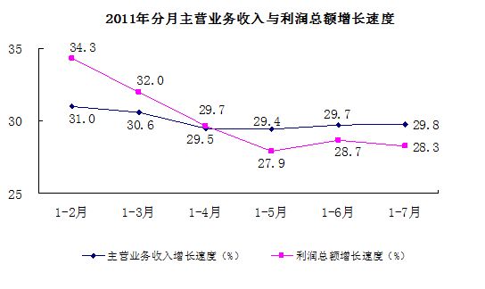 2011年分月主營業(yè)務收入與利潤總額增長速度統(tǒng)計圖。(國家統(tǒng)計局)