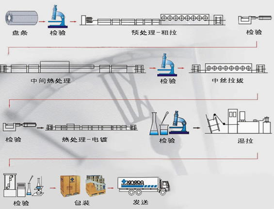 Ф5.5mm 盤條→預(yù)處理→粗拉→中絲熱處理(奧氏體化→索氏體化)→表面處理→中拉→成品前熱處理(奧氏體化→索氏體化)→表面處理→電鍍→熱擴(kuò)散→濕拉→檢驗(yàn)→包裝入庫(kù)。