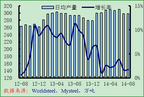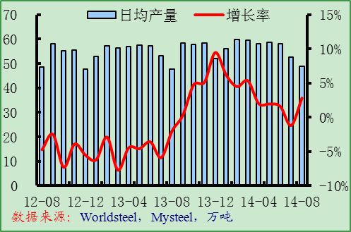 8月份亞洲粗鋼日均產量達到298.4噸,環(huán)比增長0.1%,同比增長1.7%,韓國和印度產量增長明顯。根據中鋼協的統計,9月份中國重點鋼企粗鋼日均產量環(huán)比小幅下降,而Mysteel調查的9月份全國鋼鐵PMI產出指數也有所下降。預計9月份亞洲粗鋼日均產量將環(huán)比下降。