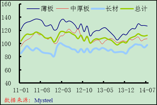 7月份德國中間商庫存小幅回升,在產量環(huán)比下降和凈出口環(huán)比持平的情況下,庫存上升表明鋼材需求明顯萎縮。分品種來看,薄板庫存小幅下降,而長材和中厚板庫存上升明顯。