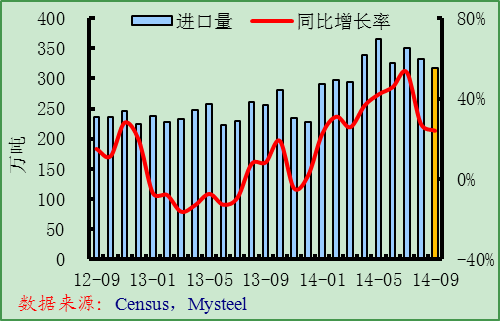 8月份美國鋼材進口量為333萬噸,同比增長27.4%,但環(huán)比下降5%。分品種看,與去年8月份相比,主要品種進口量均實現增長,依然是冷軋、鍍鋅板與中厚板的進口量增長最明顯,其中中厚板增長114%,冷軋增長65.7%,鍍鋅板增長46.1%。與今年7月份比,除半成品、長材、線材和螺紋鋼進口量環(huán)比增長外,其他品種均環(huán)比下降,其中螺紋鋼增長最快,為191.5%。最新的統計數據顯示,截至到2014年9月24日,9月份美國鋼材進口許可證數為317萬噸,高于去年9月水平,與8月份同期數據基本持平,預計今年9月份美國鋼材進口量同比仍將大幅增加,環(huán)比基本持平或略有增長。