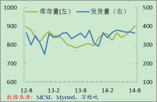 8月末美國金屬服務中心的鋼材庫存達到901.4萬短噸,環(huán)比增長3.1%,同比增長13.5%,創(chuàng)兩年來最高水平。8月份美國服務中心的發(fā)貨量為364萬短噸,同比略微增長,環(huán)比下降1.7%。按照供應天數計算,8月末的鋼材庫存為2.5個月供應量,7月末為2.4個月供應量。2013年8月末為2.2個月供應量。