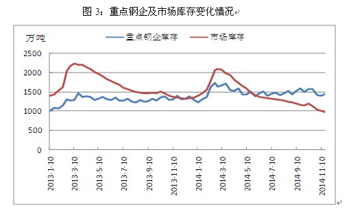 其三,鋼廠經(jīng)營(yíng)風(fēng)險(xiǎn)有所上升。由于近兩年鋼價(jià)持續(xù)大幅下跌,市場(chǎng)上的鋼貿(mào)商苦不堪言,相較于家大業(yè)大且有地方政府扶持的鋼廠,鋼貿(mào)商的日子更加難熬,在持續(xù)虧損以及資金壓力下,超半數(shù)鋼貿(mào)商選擇退出。依然活躍于市場(chǎng)的鋼貿(mào)商在操作上也不復(fù)以往的大開大合,小心謹(jǐn)慎成為了多數(shù)鋼貿(mào)商的選擇,由此帶來(lái)的直接后果就是市場(chǎng)庫(kù)存向鋼廠庫(kù)存轉(zhuǎn)移。截止2014年10月末,全國(guó)主要城市鋼材庫(kù)存約為1043萬(wàn)噸,較2013年同期相比大幅下降25.7%,與之相反的是,此時(shí)重點(diǎn)鋼企庫(kù)存增加到1414.3萬(wàn)噸,較2013年同期上升9.8%,隨著鋼貿(mào)商 “蓄水池”功能的減弱,鋼廠對(duì)于價(jià)格調(diào)整以及生產(chǎn)策略的變動(dòng)將更為敏感,但與此同時(shí)鋼廠也將承擔(dān)更大的經(jīng)營(yíng)風(fēng)險(xiǎn)。