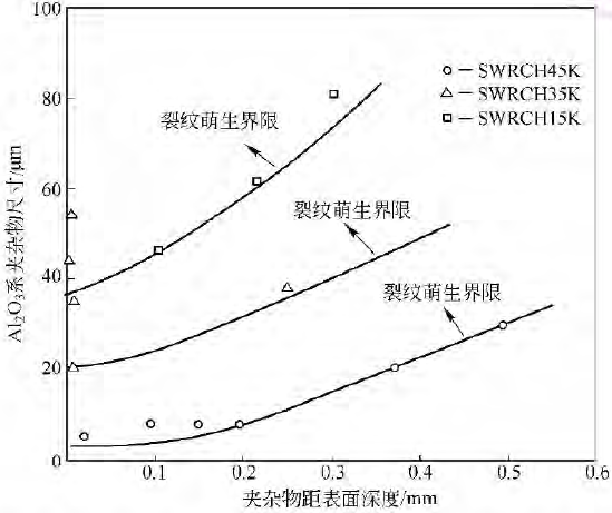 圖 不同鋼種的裂紋萌生界限與夾雜物尺寸、夾雜物距表面深度的關系