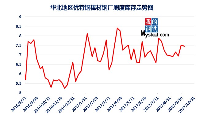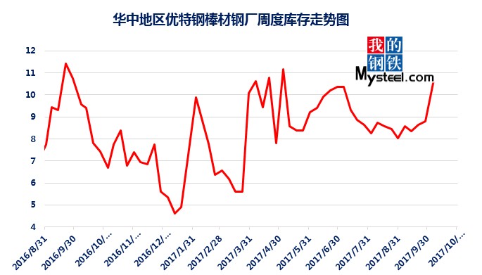 據(jù)mysteel統(tǒng)計的樣本優(yōu)特鋼廠庫存顯示,現(xiàn)全國優(yōu)特鋼廠棒材總庫存86.92萬噸,較國慶節(jié)前增加5.67萬噸,環(huán)比增加6.5%,較2016年國慶節(jié)后第一周庫存低0.31萬噸,較2016年均值高9.61萬噸,上漲12.43%。2017年內均值為84.43萬噸,當前庫存較均值增加2.49萬噸。樣本鋼廠總庫存連續(xù)7周上漲。