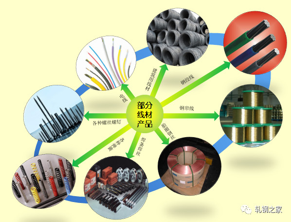 線材的用途非常廣泛,除建筑用線材等可直接被應(yīng)用的成品之外,一般都要經(jīng)過深加工才能制成產(chǎn)品。深加工的方式有熱鍛、溫鍛、冷鍛、拉拔、擠壓、回轉(zhuǎn)成形和切削等,為了便于進(jìn)行這些深加工,加工之前需要進(jìn)行退火、酸洗等處理。加工后為保證使用時(shí)的機(jī)械性能,還要進(jìn)行淬火、正火或滲碳等熱處理。有些產(chǎn)品還要進(jìn)行鍍層、噴漆、涂層等表面處理。部分線材產(chǎn)品如下圖所示。