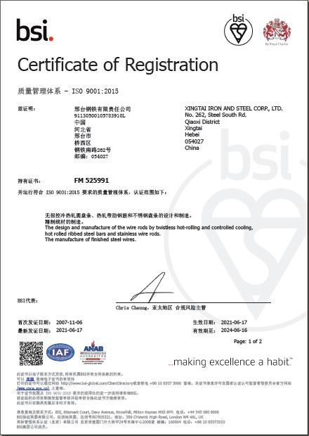 6月份,邢鋼再次通過第三方認(rèn)證機(jī)構(gòu)BSI(英國標(biāo)準(zhǔn)協(xié)會(huì))審核專家,對(duì)IATF16949質(zhì)量管理體系開展的系統(tǒng)性換證審核,并順利獲得IATF16949質(zhì)量管理體系換證證書(包括IATF 16949:2016和ISO 9001:2015),至此邢鋼已連續(xù)14年通過國際汽車行業(yè)質(zhì)量管理體系認(rèn)證。