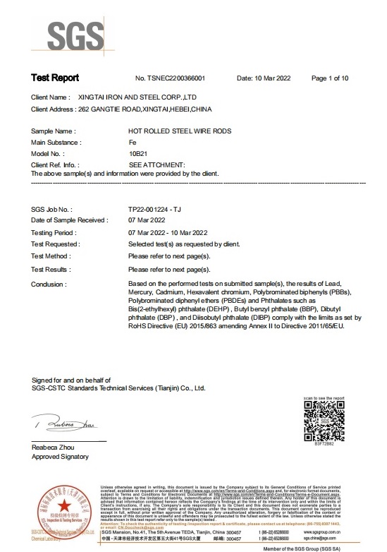 自2009年開(kāi)始,下游用戶(hù)使用邢鋼線材產(chǎn)品生產(chǎn)的緊固件、異形件被廣泛應(yīng)用于使用出口歐盟的儀器儀表等電子產(chǎn)品中,該公司每年進(jìn)行限用及有毒有害類(lèi)物質(zhì)檢測(cè),歷年、歷次檢測(cè)結(jié)果均為“未檢出”,說(shuō)明邢鋼線材產(chǎn)品在質(zhì)量安全方面具有極強(qiáng)的質(zhì)量保證能力,完全符合歐盟的管控要求。