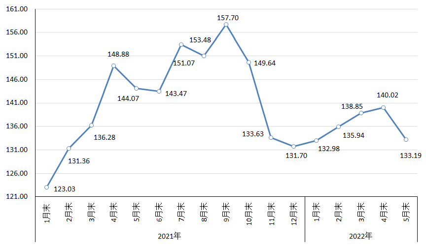 5月末,CSPI長(zhǎng)材指數(shù)為138.07點(diǎn),環(huán)比下降7.91點(diǎn),降幅為5.42%;CSPI板材指數(shù)為131.80點(diǎn),環(huán)比下降5.54點(diǎn),降幅為4.03%。與上年同期相比,長(zhǎng)材、板材指數(shù)分別下降9.58點(diǎn)和11.48點(diǎn),降幅分別為6.49%和8.01%。(見(jiàn)下表)