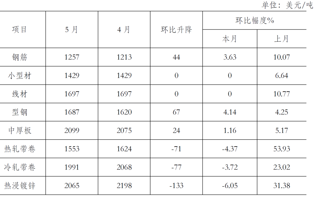 5月份,鋼鐵產(chǎn)量持續(xù)環(huán)比增長(zhǎng)。吉林,上海等疫情嚴(yán)重地區(qū)開(kāi)始復(fù)工復(fù)產(chǎn)、國(guó)家穩(wěn)增長(zhǎng)政策相繼出臺(tái),對(duì)需求的拉動(dòng)還不明顯,國(guó)內(nèi)市場(chǎng)鋼材需求增長(zhǎng)不及預(yù)期,加上鋼鐵生產(chǎn)環(huán)比增長(zhǎng),以及原燃材料價(jià)格在前期大漲后有所回落,致使鋼材價(jià)格呈小幅下行走勢(shì)。