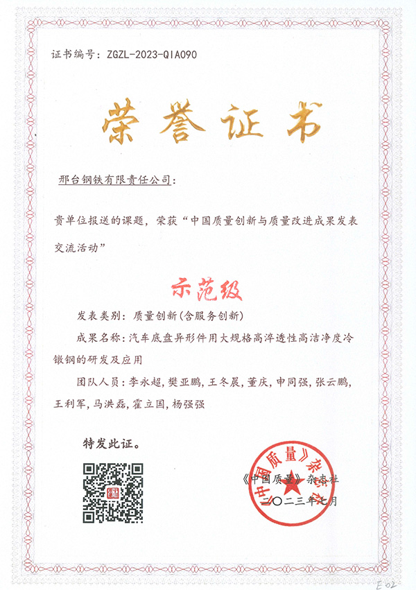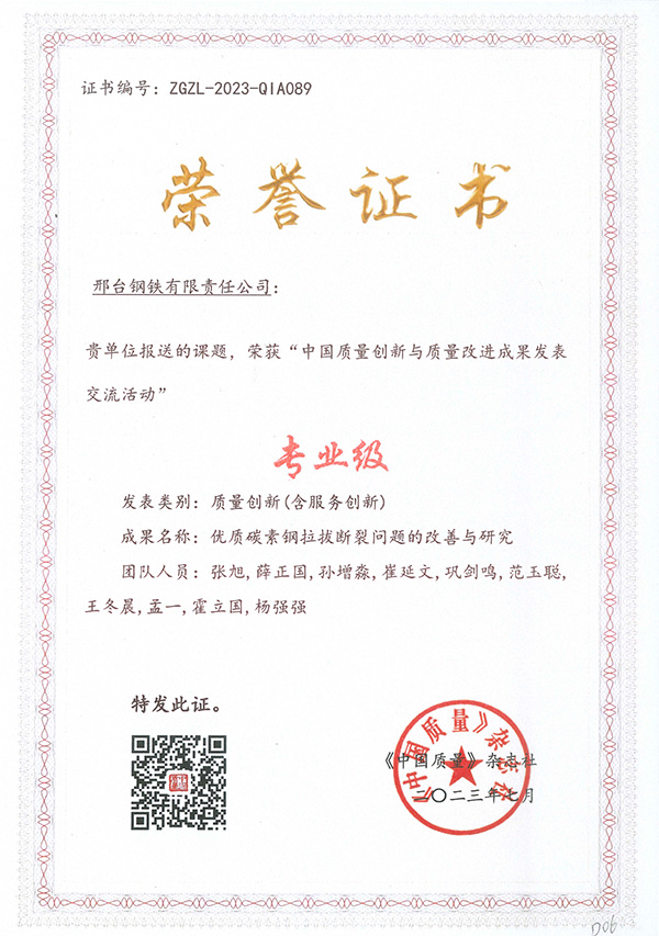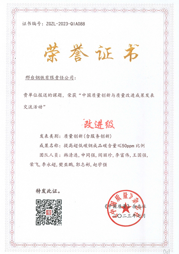 近日,由《中國質(zhì)量》雜志社主辦的“2023年中國質(zhì)量創(chuàng)新與質(zhì)量改進成果發(fā)表交流活動”在杭州圓滿結(jié)束,全國各地的電力、煙草、汽車、航空、通信、制藥、鋼鐵等行業(yè)的知名企業(yè)共計300多個成果入圍參賽。邢鋼代表團在本次活動中斬獲多項榮譽,其中:《汽車底盤異形件用大規(guī)格高淬透性高潔凈度冷鐓鋼的研發(fā)及應(yīng)用》成果榮獲“示范級”榮譽,《優(yōu)質(zhì)碳素鋼拉拔斷裂問題的改善與研究》成果榮獲“專業(yè)級”榮譽,《提高超低碳鋼成品碳含量≤50ppm比例》成果榮獲“改進級”榮譽。