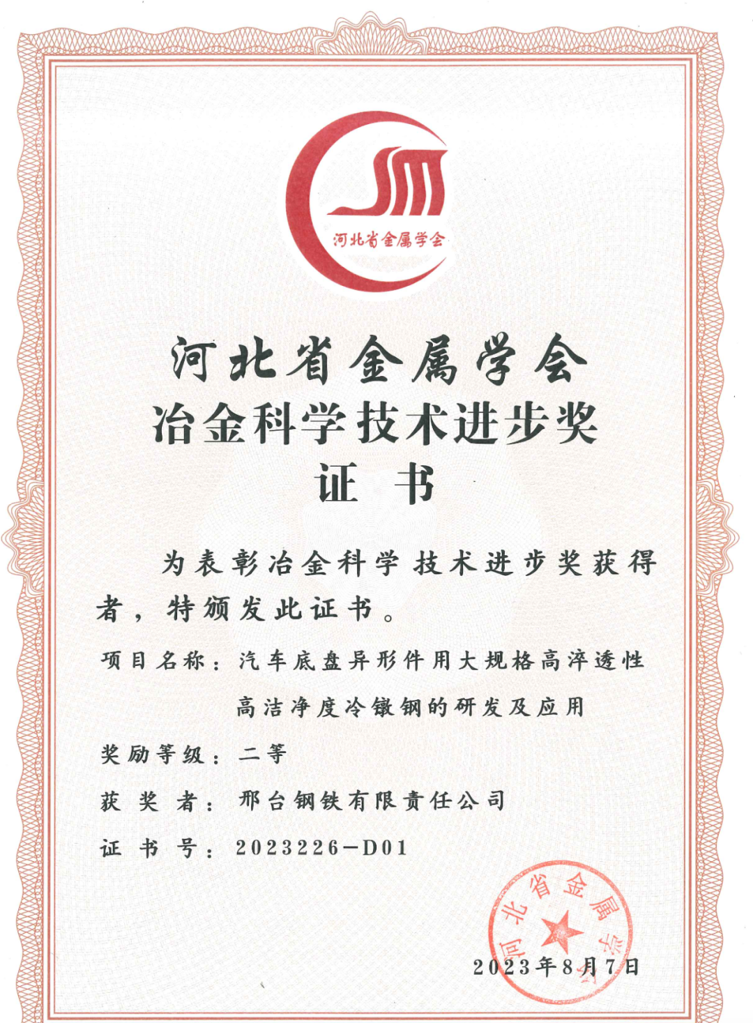 近日,邢臺鋼鐵有限責(zé)任公司兩項(xiàng)科技研發(fā)項(xiàng)目“高性能緊固件用鋼的研發(fā)及產(chǎn)業(yè)化應(yīng)用項(xiàng)目”“汽車底盤異形件用大規(guī)格高淬透性高潔凈度冷鐓鋼的研發(fā)及應(yīng)用”得到河北省金屬學(xué)會專家評審委員會的高度認(rèn)可,分別榮獲2023年度的 “河北冶金科學(xué)技術(shù)獎(jiǎng)”一、二等獎(jiǎng)。