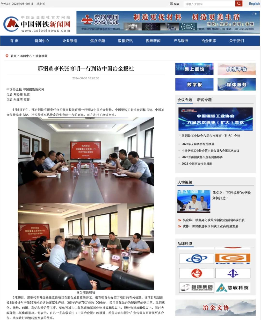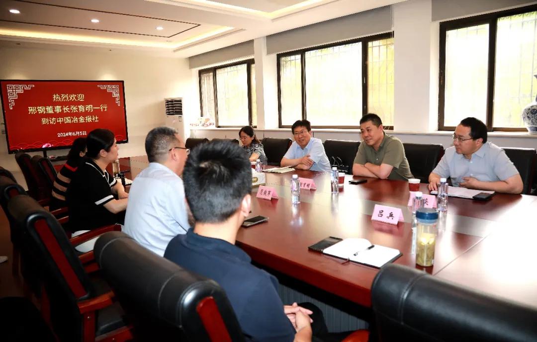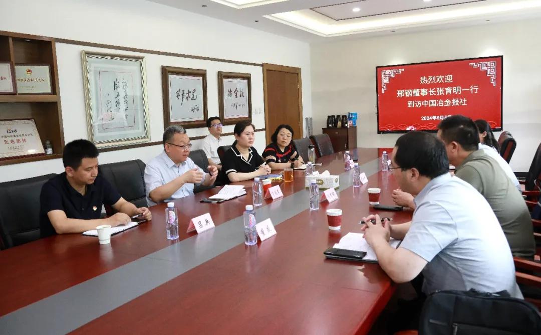 6月5日下午,邢臺鋼鐵有限責任公司董事長張育明一行到訪中國冶金報社,中國鋼鐵工業(yè)協(xié)會副秘書長,中國冶金報社黨委書記、社長范鐵軍熱情歡迎張育明一行的到來,雙方進行了座談交流。