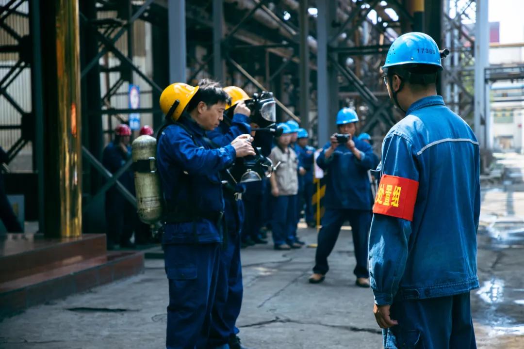 隨后,參會人員一起現(xiàn)場觀摩了邢鋼高溫熔融金屬爆噴事故現(xiàn)場應(yīng)急處置演練。本次演練,模擬煉鋼廠加料跨天車向2#轉(zhuǎn)爐加廢鋼時發(fā)生爆噴為背景,演示了事故上報、安全疏散、預(yù)案啟動、現(xiàn)場搶險、應(yīng)急救援等環(huán)節(jié)。