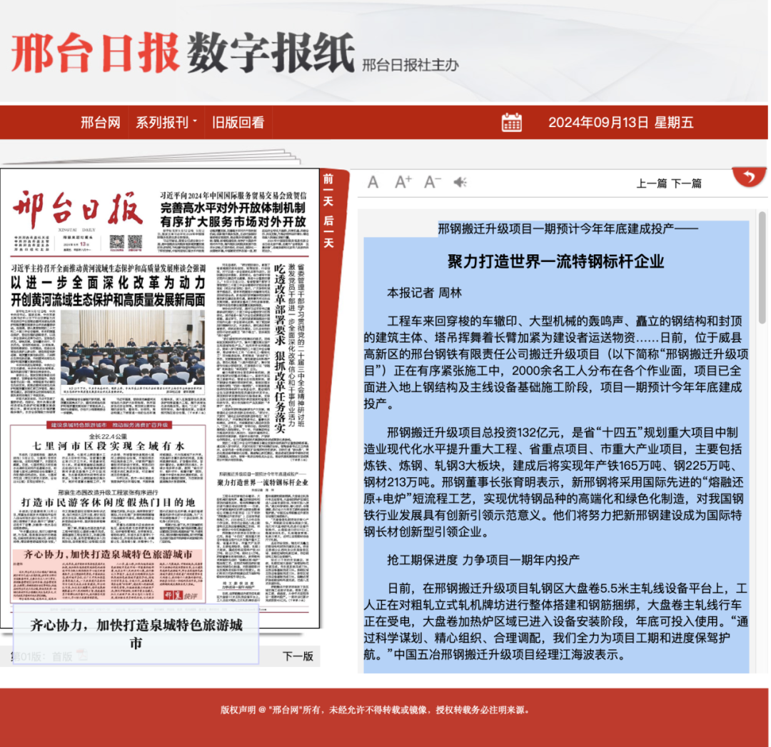 邢臺日報:邢鋼搬遷升級項目一期預(yù)計今年年底建成投產(chǎn)