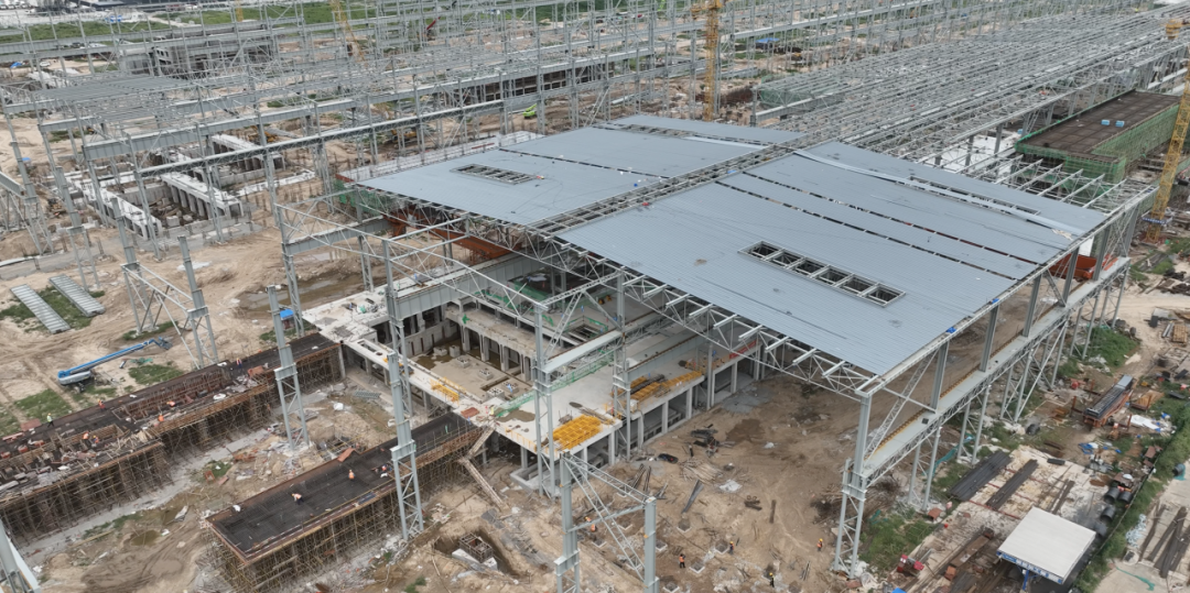 走在項目現(xiàn)場,隨處可見矗立的鋼結(jié)構(gòu)和封頂?shù)慕ㄖ黧w。項目主要部分從西向東分別是煉鐵區(qū)域、煉鋼區(qū)域和軋鋼區(qū)域,項目鋼結(jié)構(gòu)工程已全面鋪開。