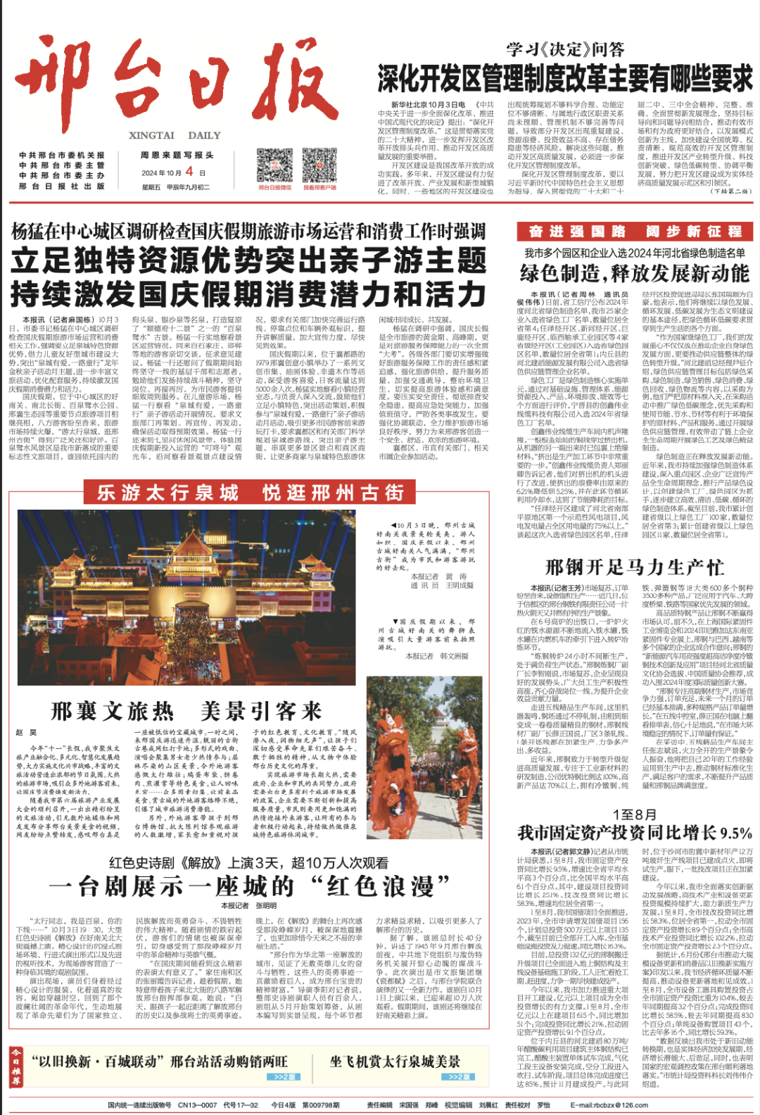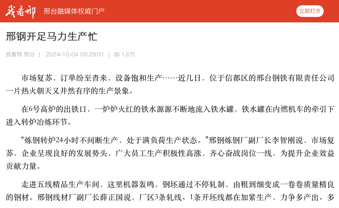 在 6 號高爐的出鐵口,一爐爐火紅的鐵水源源不斷地流入鐵水罐,鐵水罐在內(nèi)燃機車的牽引下進入轉爐冶煉環(huán)節(jié)。“煉鋼轉爐 24 小時不間斷生產(chǎn), 處于滿負荷生產(chǎn)狀態(tài)。”邢鋼煉鋼廠副 廠長李智剛說,市場復蘇,企業(yè)呈現(xiàn)良好的發(fā)展勢頭,廣大員工生產(chǎn)積極性高漲,齊心奮戰(zhàn)崗位一線,為提升企業(yè)效益貢獻力量。走進五線精品生產(chǎn)車間,這里機器轟鳴,鋼坯通過不停軋制,由粗到細變成一卷卷質(zhì)量精良的鋼材。邢鋼線材廠副廠長薛正國說,廠區(qū) 3 條軋線、 1 條開坯線都在加緊生產(chǎn),力爭多產(chǎn) 出、多收益。近年來,邢鋼致力于轉型升級促進高質(zhì)量發(fā)展,專注于工業(yè)新材料的研發(fā)制造,公司優(yōu)特鋼比例達 100%,高新產(chǎn)品達 70%以上,擁有冷鐓鋼、純鐵、彈簧鋼等 18 大類 600 多個鋼種 3500 多種產(chǎn)品,廣泛應用于汽車、大跨 度橋梁、鐵路等國家優(yōu)先發(fā)展的領域。高品質(zhì)特鋼產(chǎn)品讓邢鋼不斷贏得市場認可。前不久,在上海國際緊固件 工業(yè)博覽會和 2024 印尼雅加達東南亞緊固件專業(yè)展上,邢鋼與巴西、越南等多個國家的企業(yè)達成合作意向;邢鋼的“新能源汽車用高強度超高潔凈度冷鐓鋼技術創(chuàng)新及應用”項目經(jīng)河北省質(zhì)量 文化協(xié)會選拔、中國質(zhì)量協(xié)會推薦,成功入圍 2024 年度國際質(zhì)量創(chuàng)新大賽。“邢鋼專注高端鋼材生產(chǎn),市場競爭力強,訂單充足,未來一個月的訂單已經(jīng)基本排滿,多種規(guī)格產(chǎn)品訂單量增長。”在五線中控室,薛正國在電腦上翻看排單表,信心十足地說“,在市場大環(huán)境穩(wěn)定的情況下,訂單量有保證。”在采訪中,五線精品生產(chǎn)車間主任張志斌說,火力全開的生產(chǎn)景象令人振奮,他將把自己 20 年的工作經(jīng)驗運用到生產(chǎn)中去,推動鋼材標準化生 產(chǎn),滿足客戶的需求,不斷提升產(chǎn)品質(zhì)量和邢鋼品牌滿意度。