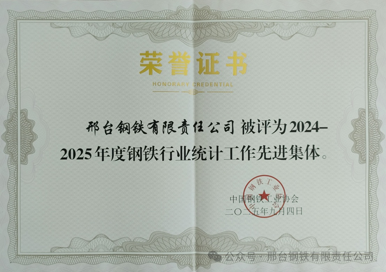 From September 10th to 12th, 2025, the Iron and Steel Industry Statistical Work Conference and the General Election Meeting of the Statistics and Information Working Committee, sponsored by the China Iron and Steel Association (CISA), were held in Qian'an, Hebei Province. Xingtai Iron and Steel Co., Ltd. (hereinafter referred to as "Xingtai Steel") was awarded the "2024-2025 Advanced Collective in Statistical Work of the Iron and Steel Industry", and Guo Xingkun from the company also won the title of "Advanced Worker in Statistical Work of the Iron and Steel Industry". This is the second time Xingtai Steel has won the honor after seven years, reflecting the enterprise's continuous progress in data statistics and informatization construction as well as high recognition from the industry.